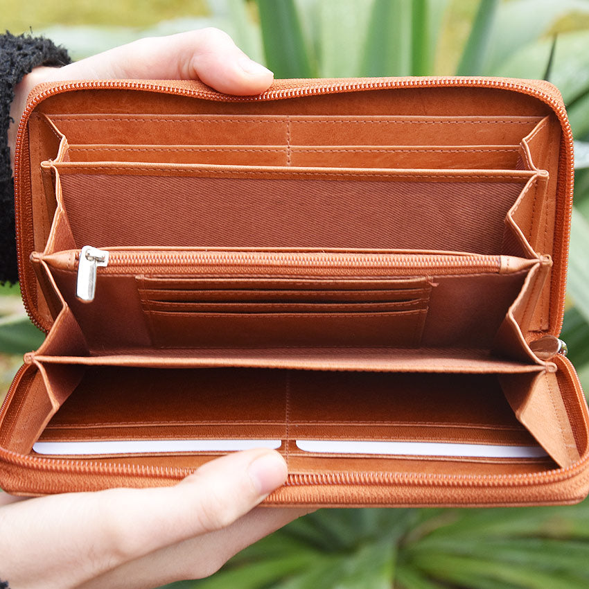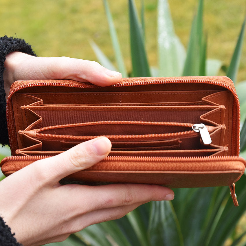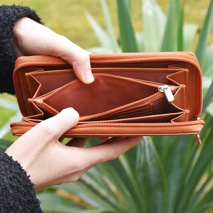 Mittig der Geldbörse versteckt jeweils ein großes Einsteckfach nach links bzw. rechts gehend und mit einem Reißverschluss verschließbar.