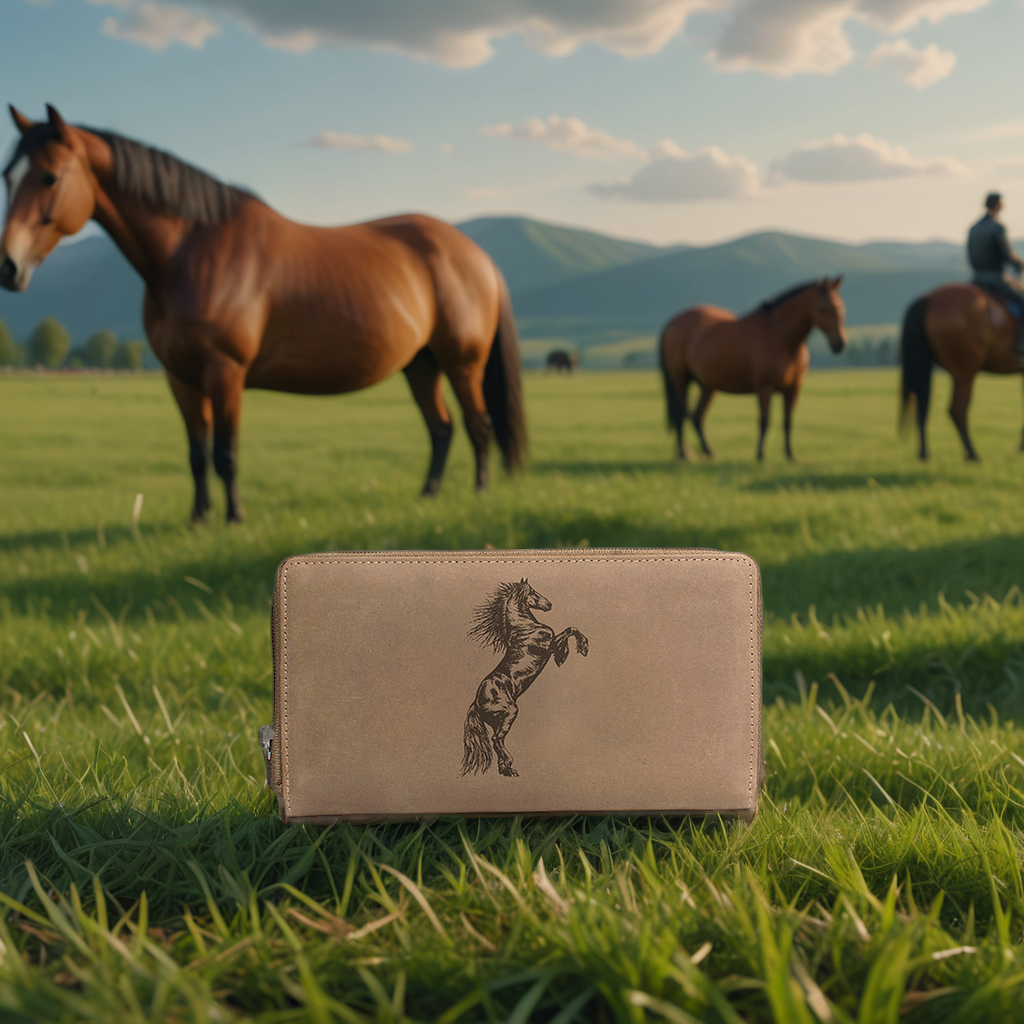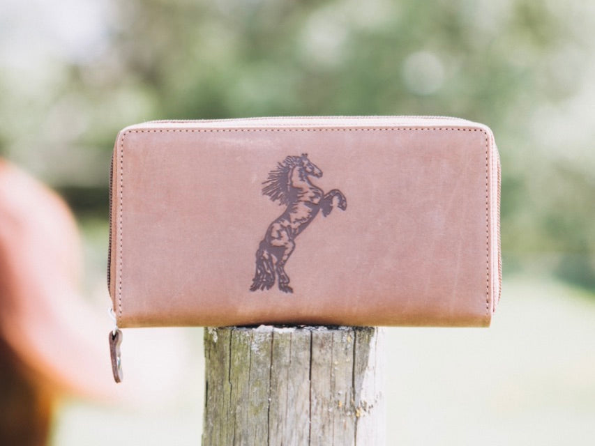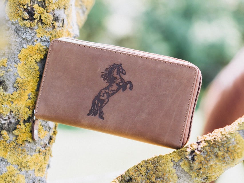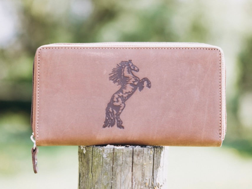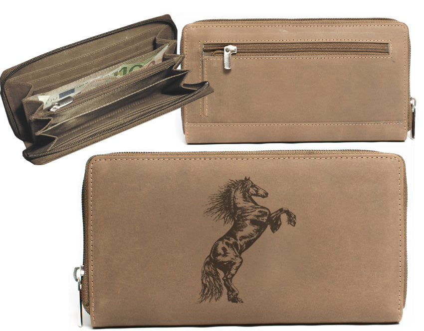 Die Geldbörse wird mit einem Reißverschluss verschlossen. Aufgeklappt befindet sich rechts und links jeweils an der Rückseite ein großes Einsteckfach. Davor jeweils quer 6 Kartensteckfächer. Es folgen insgesamt 4 große Fächer für Geldscheine, Handys etc. und mittig ein Münzenfach, verschließbar mit einem Reißverschluss.