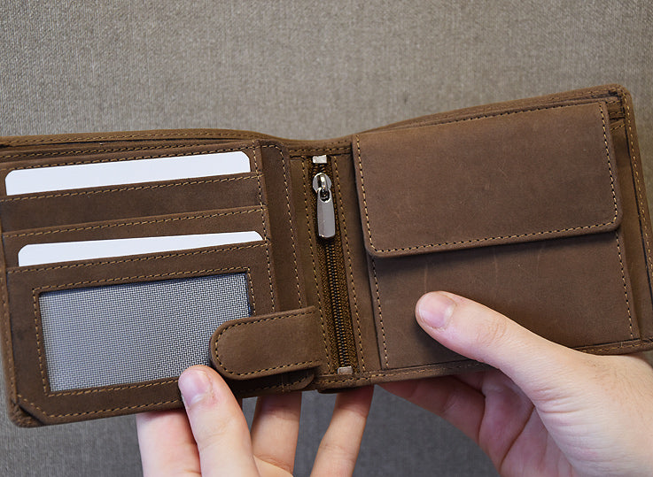 Mittig der Geldbörse versteckt jeweils ein großes Einsteckfach nach links bzw. rechts gehend und mit einem Reißverschluss verschließbar.