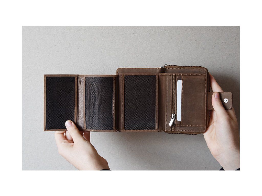 Verschlossen wird mit einer Lasche mit Druckknopf, welche rechts mittig der Geldbörse angebracht ist.