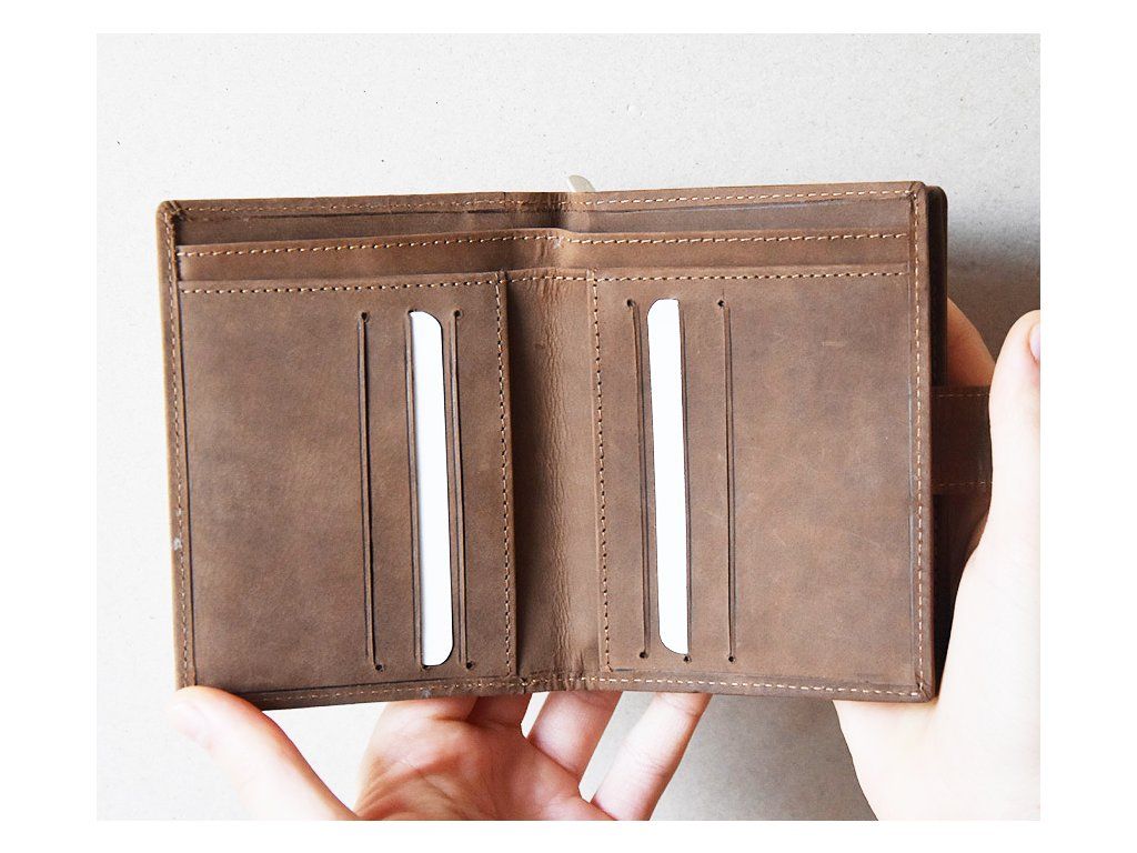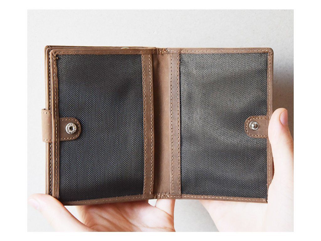 - Teil – wird mit einer Lasche mit Druckknopf geschlossen. Quer - beidseitig jeweils 3 Kartensteckfächer und 1 großes Einsteckfach links bzw. rechts geöffnet. Dahinter das Geldscheinfach.