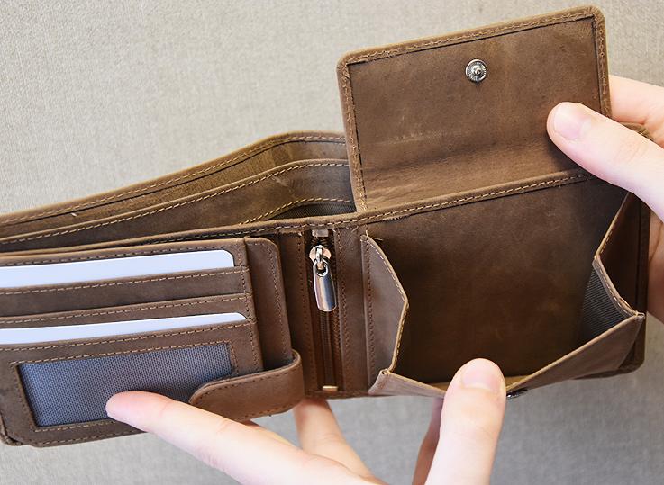 Rechts befindet sich ein großes Münzenfach ebenso mit Druckknopf.
