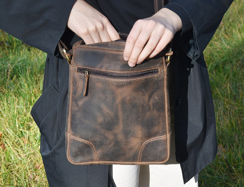 Diese praktische unisex Umhängetasche aus hochwertigem Rindsleder bietet ausreichend Platz für alle wesentlichen Kleinigkeiten des täglichen Bedarfs. Schlüssel, Geldbörse, Handy und sogar ein kleiner Terminplaner finden problemlos in dieser kompakten Schultertasche Platz, dank des praktischen Schultergurts. Interessanterweise lässt sich der Schultergurt leicht auf die benötigte Länge anpassen. Neben dem Hauptfach, das mit einem Reißverschluss gesichert wird, verfügt diese kleine Umhängetasche über zwei weitere Fächer, die auf die gleiche Art verschlossen werden.